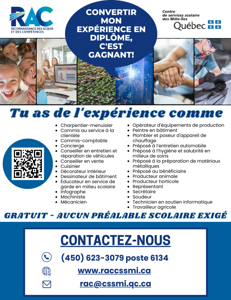Les services de reconnaissance des acquis et des compétences (RAC) permettent de reconnaître les compétences professionnelles ou personnelles pour l’obtention d’un diplôme d’études secondaires (DES) ou d’un diplôme d’études professionnelles (DEP). La RAC facilite également la recherche d’un nouvel emploi et l’avancement de la carrière.